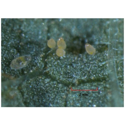 Oval, 0.2 mm uzunlukta; yaprak altına tek tek bırakılır. |