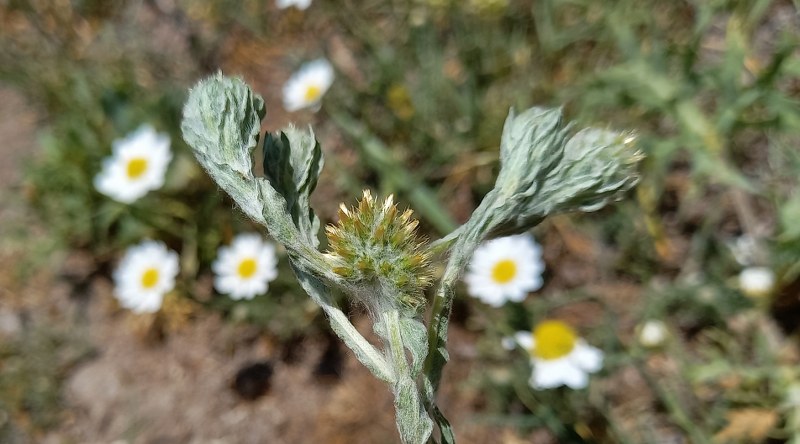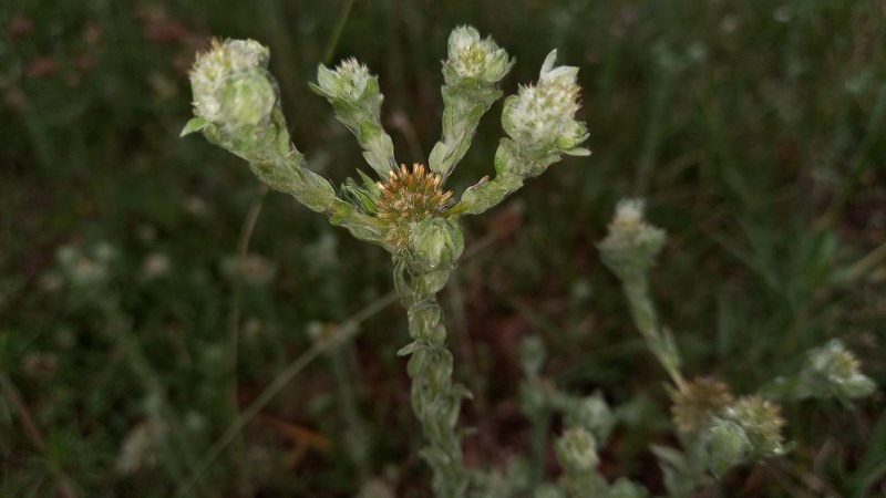 Olgun Bitki: Bitki boyu: 10 ila 35 cm. Dik büyüyen bitkinin üst gövdesi çatallıdır. Gümüşi beyaz kaba tüylerle kaplıdır. Yapraklar: Yapraklar sapsız, dar, mızraksı ve gövdede birbirine çok yakın (bazen üst üste binmiş) bulunurlar. Çiçek durumu: Sapsız kapitulalar yumurta biçiminde ve gövdenin ucunda bulunur ve tabandan çatallanırlar. Küçük sarı çiçekler olgunlaştığında birbirinden uzaklaşır. İnvolukrumu oluşturan brakteler sarı noktalı ve düzdür. Meyve: Kapitulanın (çiçek başçığı) çevresindeki aken tipi meyveler pappussuz, içindekiler pappusludur (tüylü demetli).