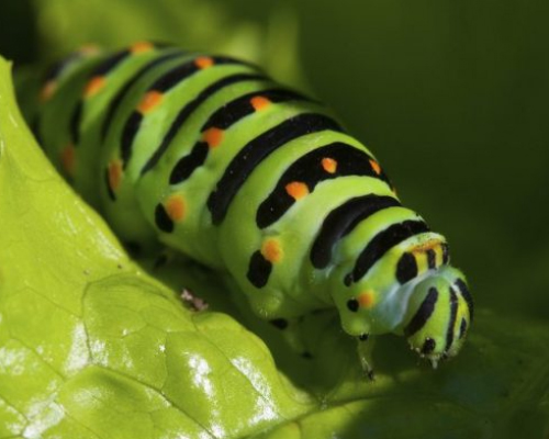 ✓ Yaprak yeşil tırtılı ön kanatların dipten mavimsi, siyah ve gümüşi kahverengi; uç kısmı ise beyaz renkli olup, kenarlarında açık kahverenkli lekeler vardır. Larva Baş, göğüs, anal plakalar ve göğüs bacakları parlak siyah renklidir. Sırt kısmında boyuna uzanan koyu yeşil renkli bir şerit, vücut halkaları üzerinde de siyah renkli kabarcıklar vardır.