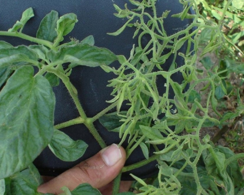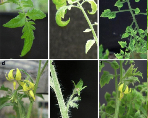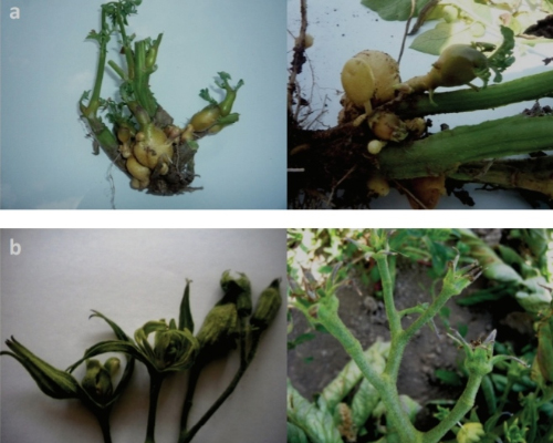 ✓ Hastalığın başlangıç belirtileri, büyümekte olan genç sürgünlerde, yapraklarda küçülme, hafif morumsu renk alması, ileri aşamada tamamen dumura uğrama ve hafif yukarı doğru kıvrılma şeklindedir. Hastalığın ileri dönemlerinde çiçekte şekil bozuklukları görülür. Genel olarak çanak yapraklarda anormal büyüme, taç yapraklarda tamamen veya kısmen dumura uğrama, dişi ve erkek organlarda deformasyon ve kısırlaşma meydana gelir Çiçekteki bu belirtisi nedeniyle hastalık “domateste iri tomurcuk” olarak adlandırılır. Çiçeklenme periyodundan önce gerçekleşen erken enfeksiyonlarda, hiçbir çiçeğin oluşmadığı görülür. Böyle durumlarda meyve oluşmamaktadır. Geç enfeksiyonlarda ise inkübasyon periyodundan önce döllenmiş meyveler olum dönemine kadar gelebilir. Böyle meyvelerin bir kısmı tamamen sertleşmiş, odunlaşmıştır, meyve tatsız ve susuzdur.