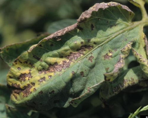 Daha az karakteristik belirti yapraklarda ortaya çıkar, hastalık belirtileri yapraktan başka diğer yeşil aksamlarda ve çiçeklerde de görülebilir. Tek bir yaprak lekesi başlangıçta yuvarlak, siyah ile koyu arasında bir renkte ve herhangi bir hale ile kuşatılmamıştır. Yaprakta lekeler birlikte orta çıkar ve birbiri ile düzensiz bir şekilde bütünleşir.