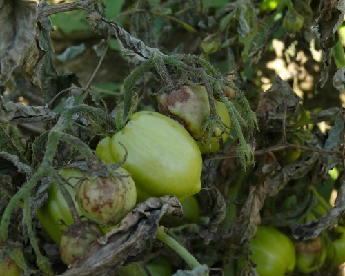 Domates mildiyösü [Phytophthora infestans (Mont) de Bary]’nün konidioforları renksiz, seyrek dallı ve kalın zarlıdır. Konidioforları, yapraklarda stomalardan çıkarlar. Uçlarında limon şeklinde konidiosporlar bulunur. Konidiosporlar ince zarlı olup 21–38x12–23µm büyüklüğündedir. Hastalık etmeni, kışı çürümüş hastalıklı bitki artıklarında oospor halinde geçirir. İlkbaharda oosporların çimlenmesiyle primer enfeksiyonlar başlar. Yapraklardaki lekeler üzerinde oluşan konidiosporlar rüzgâr ile sağlam bitkilere taşınırlar. Konidiosporların çimlenmesi, enfeksiyonu, yaprak içindeki gelişmeleri ve yeni üreme organları meydana getirmeleri patates mildiyösünde olduğu gibidir. Epidemi ise 19–22°C’de ve orantılı nemin %80’nin üstünde bulunması halinde gerçekleşir.