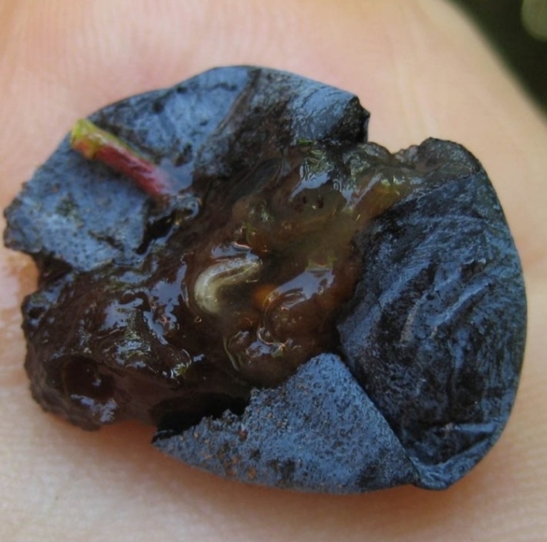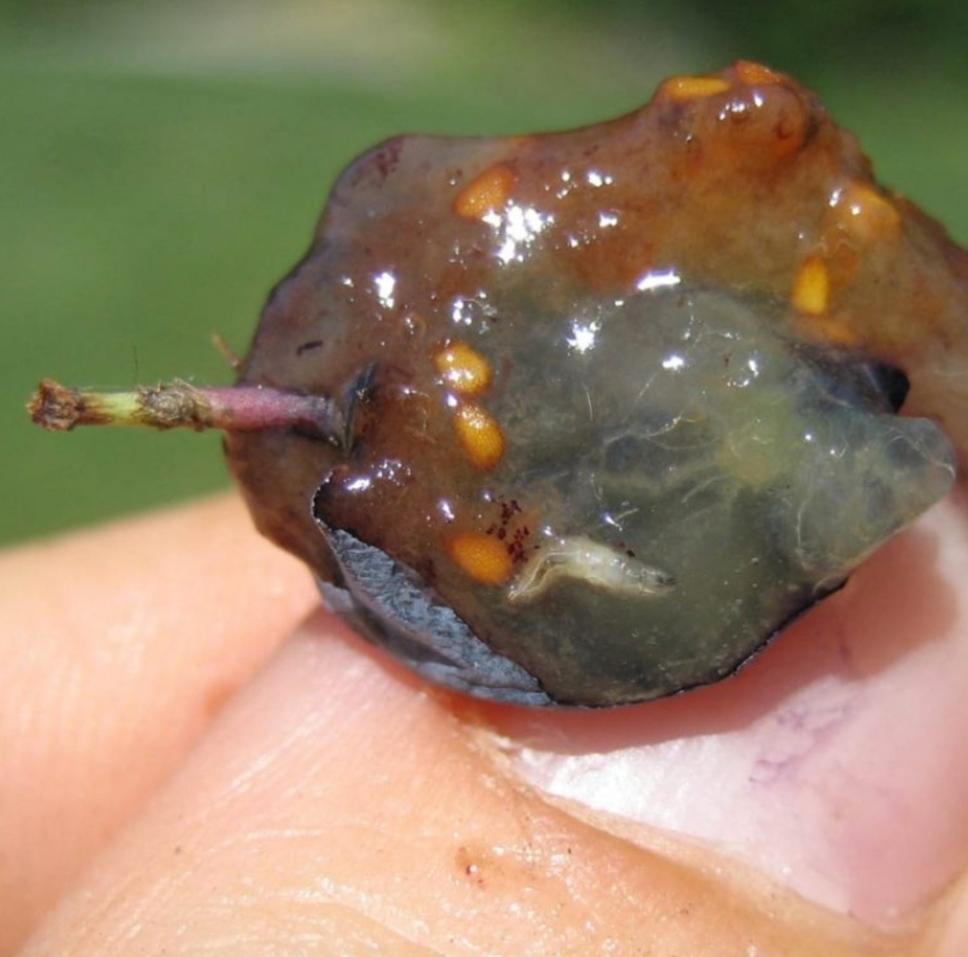 Dişi sinekler olgunlaşan meyveye yumurta bırakır. Larvalar meyvenin içinde beslenir, eti kahverengi, yumuşak ve sızdıran hale getirir. Hasar, ikincil hastalıklar tarafından enfeksiyon için bir giriş yeri sağlayabilir. Bu yaralanma pazarlanamayan meyve ve ekonomik kayıplara neden olur.